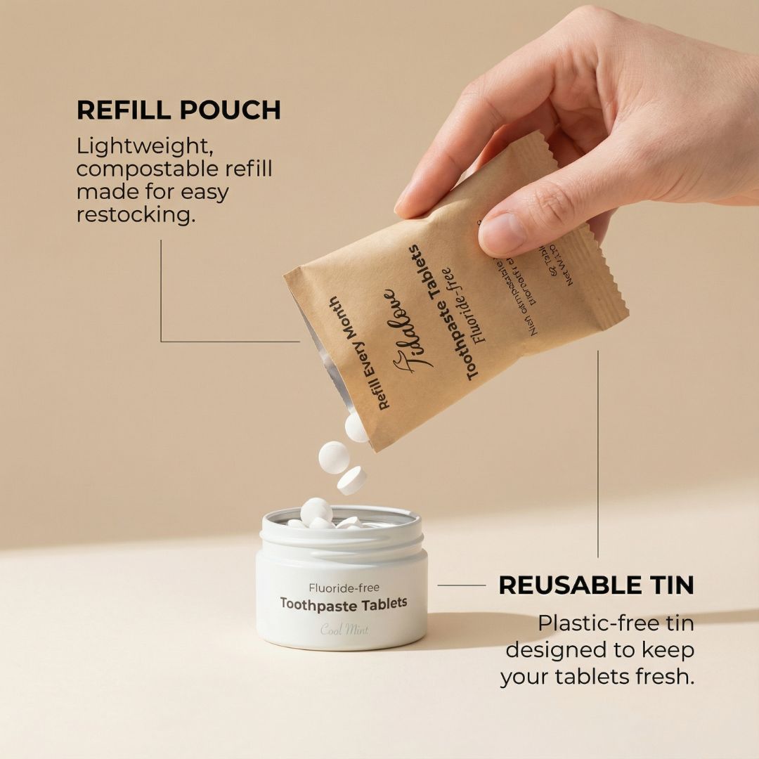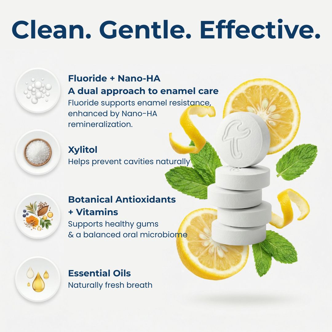Vegan & Cruelty-FreeGet a gentle and refreshing teeth cleaning experience with our toothpaste tablets, made with natural ingredients and free from harsh chemicals, SLS, gluten, artificial colors, and animal products.