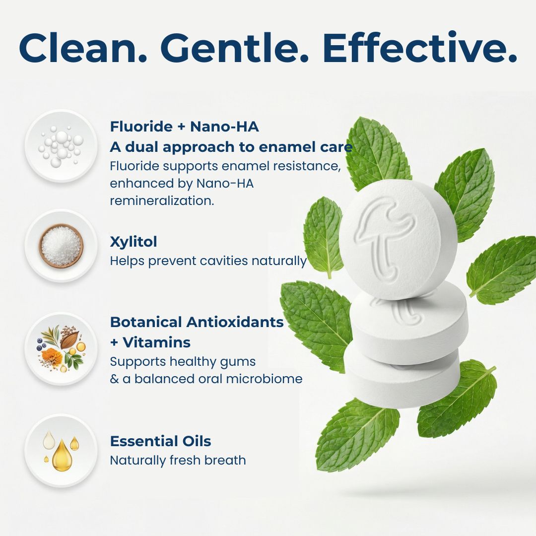 Upgrade your brushing routine with our Cool Mint Toothpaste Tablets. Fluoride and Nano-Hydroxyapatite (n-HAP) strengthen enamel and protect against cavities, while Xylitol helps reduce bacteria. Antioxidant-rich botanicals and vitamins support gum health, leaving your smile clean, fresh, and confident.